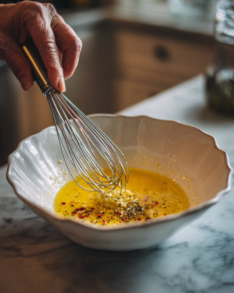 - In a bowl, combine melted butter, olive oil, minced garlic, lemon juice, lemon zest, red pepper flakes, salt, black pepper, and Italian seasoning. Mix thoroughly.