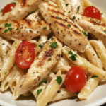 Creamy Garlic Chicken Pasta Salad brings together tender chicken, silky garlic dressing, and perfectly cooked pasta in a bowl that feels both hearty and refreshing. The combination of savory chicken and rich creamy sauce creates a balanced dish that works beautifully for lunches, gatherings, or relaxed evening meals.