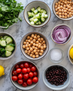Chickpeas are the star of this recipe. Their slightly nutty flavor and firm texture hold up beautifully in salads. Unlike softer beans, chickpeas maintain their structure even after marinating in dressing.